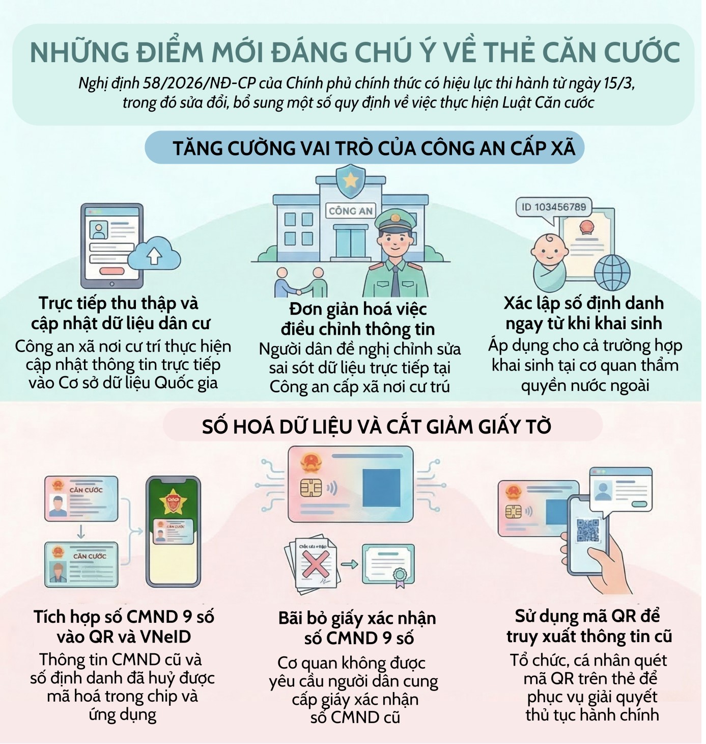 Từ ngày 15/3/2026, Nghị định 58/2026/NĐ-CP của Chính phủ chính thức có hiệu lực thi hành, trong đó sửa đổi, bổ sung một số quy định về việc thực hiện Luật Căn cước. Với những sửa đổi mang tính đột phá, Nghị định không chỉ cắt giảm các loại giấy tờ rườm rà mà còn tối ưu hóa quyền lợi cho người dân trên môi trường số. Mở rộng trách nhiệm của công an xã Một trong những điểm mới đáng chú ý của Nghị định 58/2026/NĐ-CP là mở rộng trách nhiệm của công an cấp xã trong thu thập, cập nhật và khai thác dữ liệu dân cư, phù hợp với mô hình tổ chức bộ máy mới khi không còn công an cấp huyện. Theo đó, công an cấp xã nơi công dân cư trú có trách nhiệm thu thập, cập nhật thông tin công dân vào Cơ sở dữ liệu quốc gia về dân cư từ nhiều nguồn như giải quyết thủ tục cư trú, sổ sách quản lý cư trú, hồ sơ tàng thư và từ việc cấp, cấp đổi, cấp lại thẻ căn cước. Nghị định 58/2026/NĐ-CP làm rõ cơ chế điều chỉnh thông tin trong cơ sở dữ liệu khi công dân phát hiện thông tin do mình cung cấp có sai sót hoặc thay đổi. Khi đó, công dân đề nghị công an cấp xã thực hiện điều chỉnh theo trình tự, thủ tục quy định. Nghị định cũng mở rộng phạm vi xác lập số định danh cá nhân ngay từ khâu đăng ký khai sinh, bao gồm cả trường hợp ghi vào sổ hộ tịch việc khai sinh đã đăng ký tại cơ quan có thẩm quyền của nước ngoài. Số chứng minh nhân dân 9 số, số định danh cá nhân đã hủy vẫn được tích hợp trong ứng dụng VneID Nghị định 58/2026/NĐ-CP nêu rõ thông tin số chứng minh nhân dân 9 số, số định danh cá nhân đã hủy được mã hóa, tích hợp trong mã QR trên thẻ căn cước, trong bộ phận lưu trữ của thẻ căn cước, trên Ứng dụng định danh quốc gia (VNeID). Cơ quan, tổ chức, cá nhân quét mã QR trên thẻ căn cước, khai thác thông tin trong bộ phận lưu trữ của thẻ căn cước, khai thác thông tin trên Ứng dụng định danh quốc gia (VNeID) và sử dụng thông tin số chứng minh nhân dân 9 số, số định danh cá nhân đã hủy truy xuất được qua mã QR, trong bộ phận lưu trữ của thẻ căn cước, khai thác thông tin trên Ứng dụng định danh quốc gia (VNeID) để phục vụ giải quyết thủ tục hành chính, dịch vụ công, các giao dịch và hoạt động khác; không được yêu cầu công dân phải cung cấp xác nhận số chứng minh nhân dân 9 số, số định danh cá nhân đã hủy. Trình tự, thủ tục cấp, cấp đổi, cấp lại thẻ căn cước Theo quy định được sửa đổi, đối với trường hợp người dưới 6 tuổi đề nghị cấp, cấp đổi, cấp lại thẻ Căn cước; công dân đề nghị cấp lại do mất thẻ, thẻ hư hỏng không sử dụng được hoặc cấp đổi do thay đổi địa giới hành chính thông qua Cổng dịch vụ công quốc gia hoặc ứng dụng VneID. Kết quả tích hợp được thông báo khi trả thẻ Căn cước cho công dân. Công dân hoặc người đại diện hợp pháp thực hiện thanh toán lệ phí tích hợp, cập nhật, điều chỉnh thông tin trên thẻ và phí dịch vụ chuyển phát theo quy định của pháp luật về phí và lệ phí. Việc ban hành Nghị định số 58/2026/NĐ-CP góp phần hoàn thiện các quy định pháp luật trong lĩnh vực căn cước, tạo điều kiện thuận lợi cho người dân trong quá trình thực hiện các thủ tục hành chính, đồng thời nâng cao hiệu quả công tác quản lý nhà nước về an ninh, trật tự. Đinh Trúc - PBGDPL